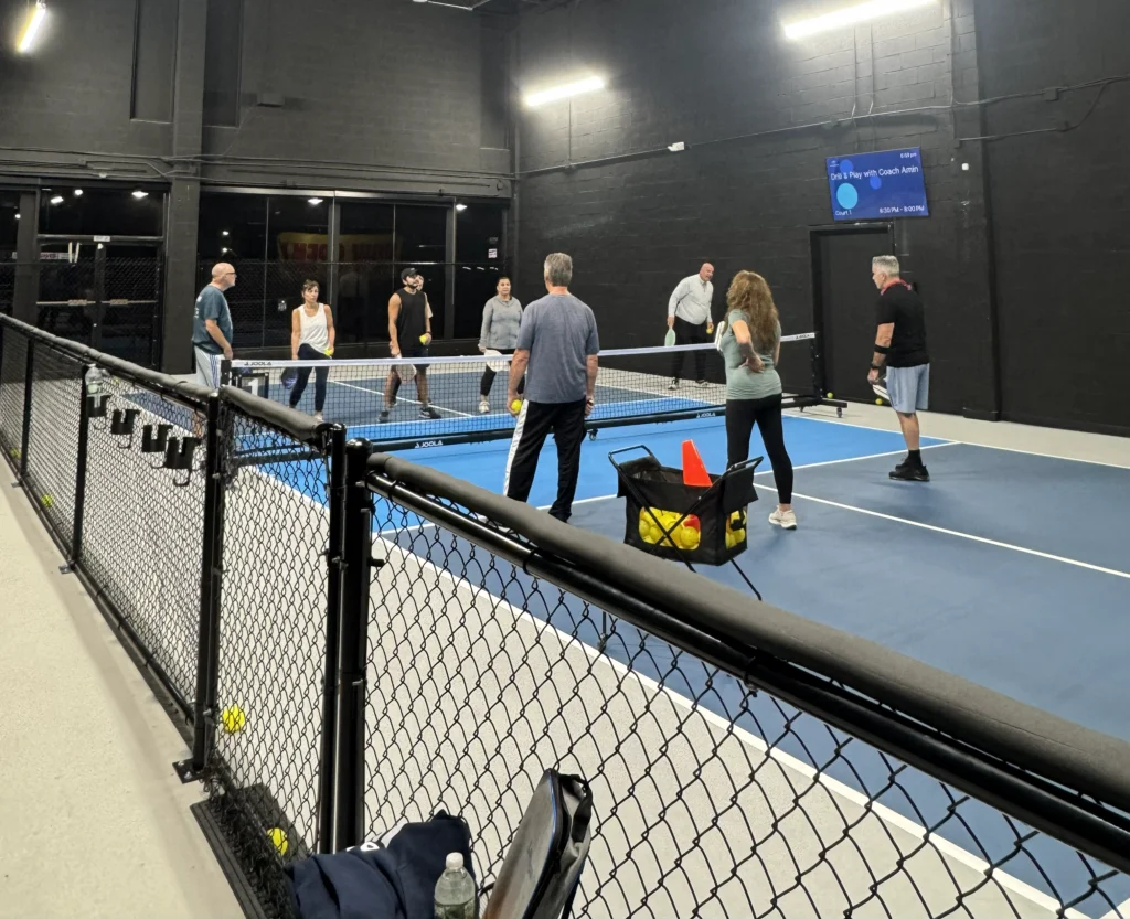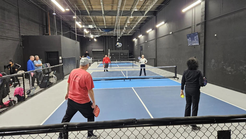 State-of-the-art pickleball facility featuring 3 Professional Laykold Cushion Plus Courts wih high ceilling and professional lighting for unmatched playability, ensuring every serve, volley, and rally feels just right.